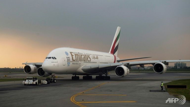 Một chiếc máy bay Airbus A380-800 của hãng hàng không Emirates tại sân bay Suvarnabhumi ở thủ đô Bangkok, Thái Lan. Ảnh: AFP