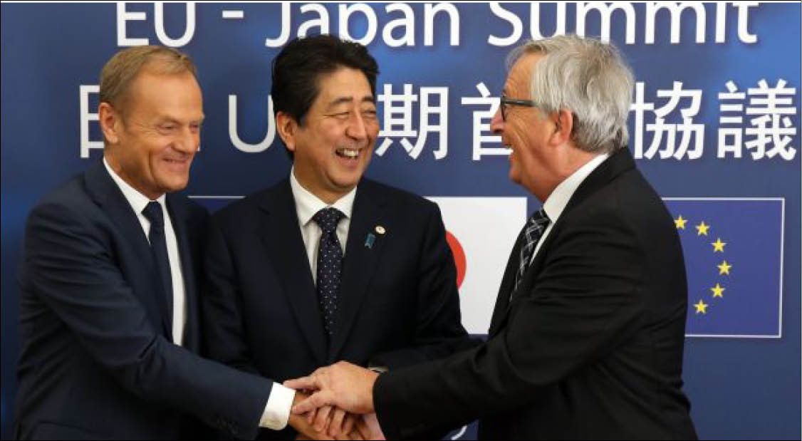Thủ tướng Nhật Bản Shinzo Abe (giữa), Chủ tịch Hội đồng châu Âu Donald Tusk (bên trái) và Chủ tịch Ủy ban châu Âu Jean-Claude Juncker trong một cuộc gặp. Ảnh: EPA