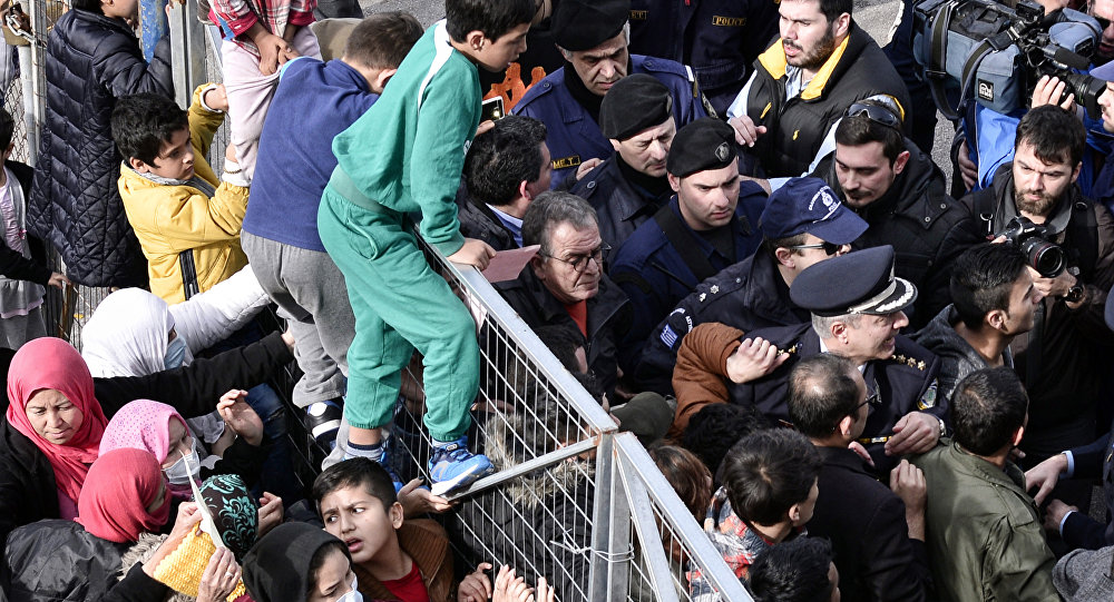 Người di cư chặn lối vào trại tị nạn Hellinikon ở Athens, Hy Lạp để phản đối điều kiện sống nghèo nàn. Ảnh: AFP