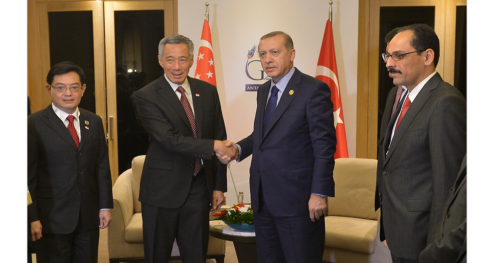 Thủ tướng Singapore Lý Hiển Long bắt tay Thủ tướng Thổ Nhĩ Kỳ Binali Yildirim. Ảnh: CNA