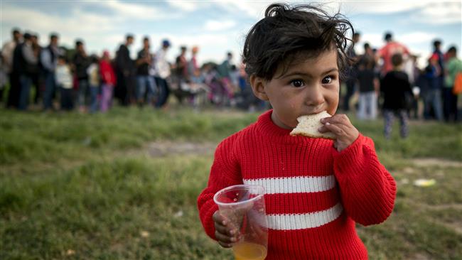 Trẻ em tị nạn đang ăn bánh sandwich ở một trại tạm trú trên biên giới Hy Lạp-Macedonian. Ảnh: AFP