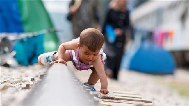 Bé gái tị nạn nhặt gói bánh quy trên một đường ray ở trại tạm trú gần ngôi làng Idomeni, Hy Lạp. Ảnh: AFP