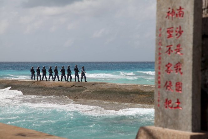 Lính Trung Quốc tuần tra trên một đảo chiếm đóng trái phép tại Hoàng Sa tháng 2/2016. Ảnh: Reuters