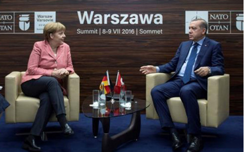 Thủ tướng Đức Angela Merkel trong một cuộc thảo luận với Tổng thống Thổ Nhĩ Kỳ Tayyip Erdogan bên lề Hội nghị Thượng đỉnh NATO. Ảnh :Reuters
