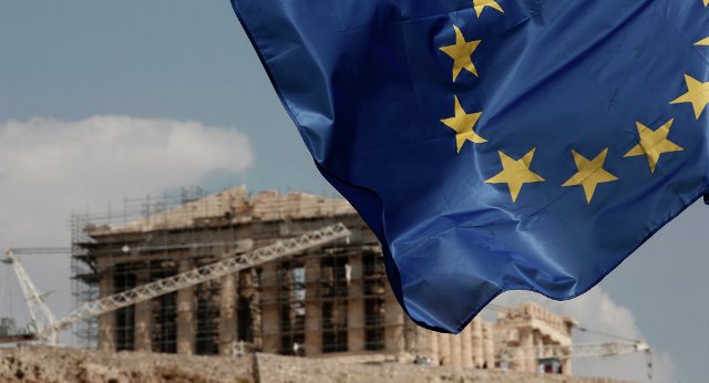 Lá cờ của Liên minh châu Âu (EU) trước ngôi đền Parthenon ở Athens, Hy Lạp. Ảnh: AP