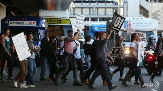 | Người biểu tình phản đối lệnh cấm nhập cảnh của ông Trump tại một sân bay - Ảnh: AFP |