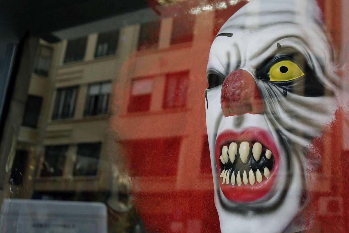 Bộ trang phục hình chú hề đáng sợ treo trong một cửa hàng ở thành phố Valencia, Tây Ban Nha. Ảnh: EPA