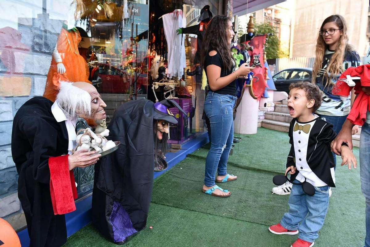 Đồ trang trí và trang phục Halloween bày bán bên ngoài một cửa hàng ở thủ đô Beirut, Lebanon làm cậu bé sợ hãi. Ảnh: EPA