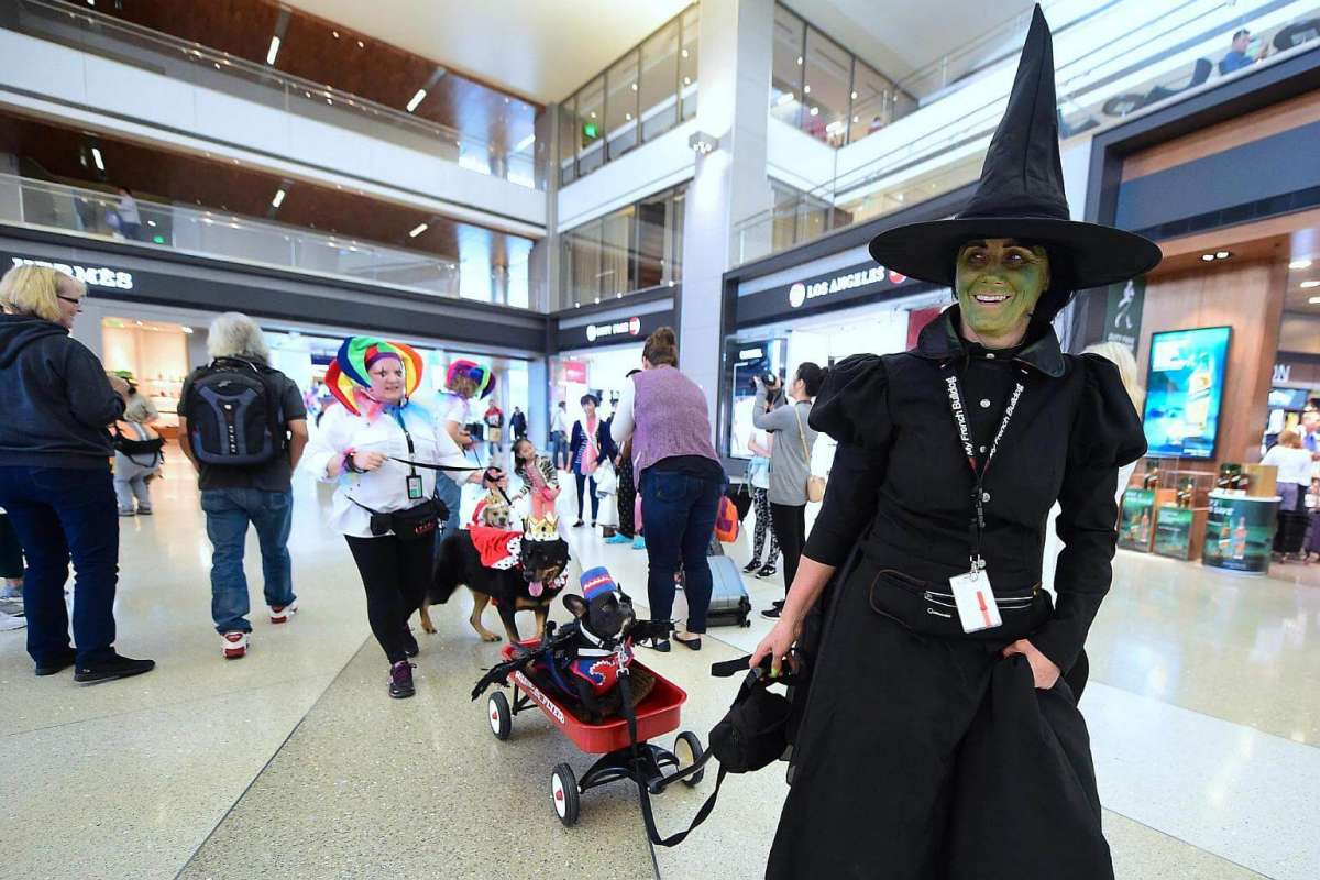 Hóa trang thành "bà phù thủy xấu xa" của phương Tây tại sân bay quốc tế Los Angeles, thành phố Los Angeles, bang California, Mỹ. Ảnh: AFP