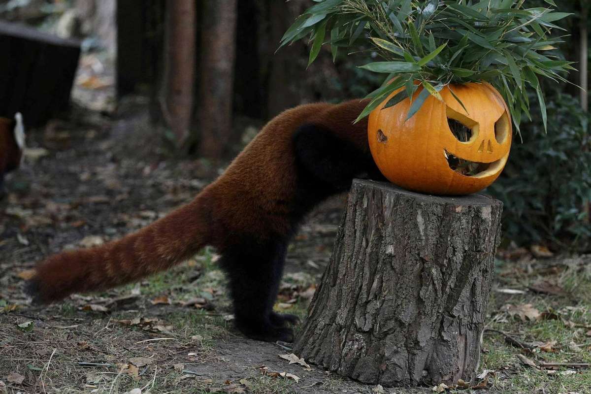 | Một con gấu trúc đỏ đang tìm thức ăn bên trong quả bí ngô Halloween tại vườn thú Chester, thành phố Chester, Anh. Ảnh: Reuters |