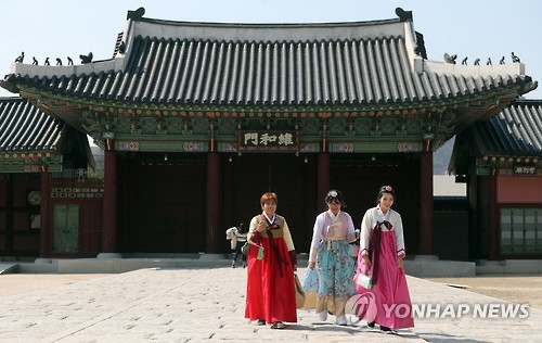 Du khách Việt Nam trong trang phục truyền thống của Hàn Quốc trước một cung điện ở Seoul. Ảnh: Yonhap