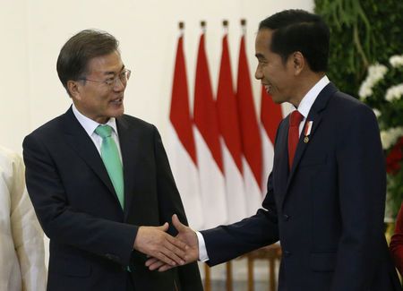 Tổng thống Hàn Quốc Moon Jae-in và người đồng cấp Indonesia Joko Widodo trong một cuộc gặp tại Dinh Tổng thống ở thành phố Bogor, Indonesia. Ảnh: Reuters