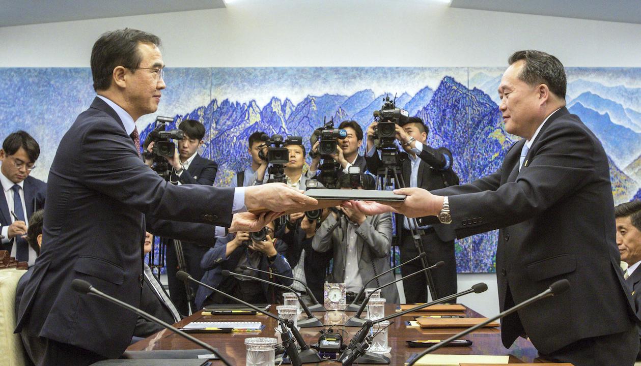 Quan chức Hàn Quốc - Triều Tiên trao đổi văn kiện trong một cuộc họp. Ảnh: Wikitree