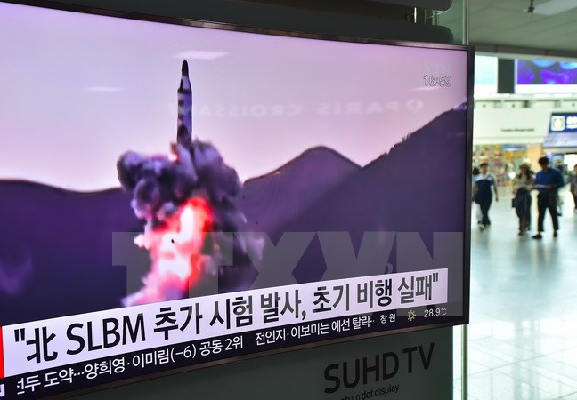 Hình ảnh được phát qua truyền hình tại nhà ga tàu hỏa ở Seoul, Hàn Quốc ngày 9/7 cho thấy Triều Tiên phóng thử tên lửa. (Nguồn: AFP/TTXVN)