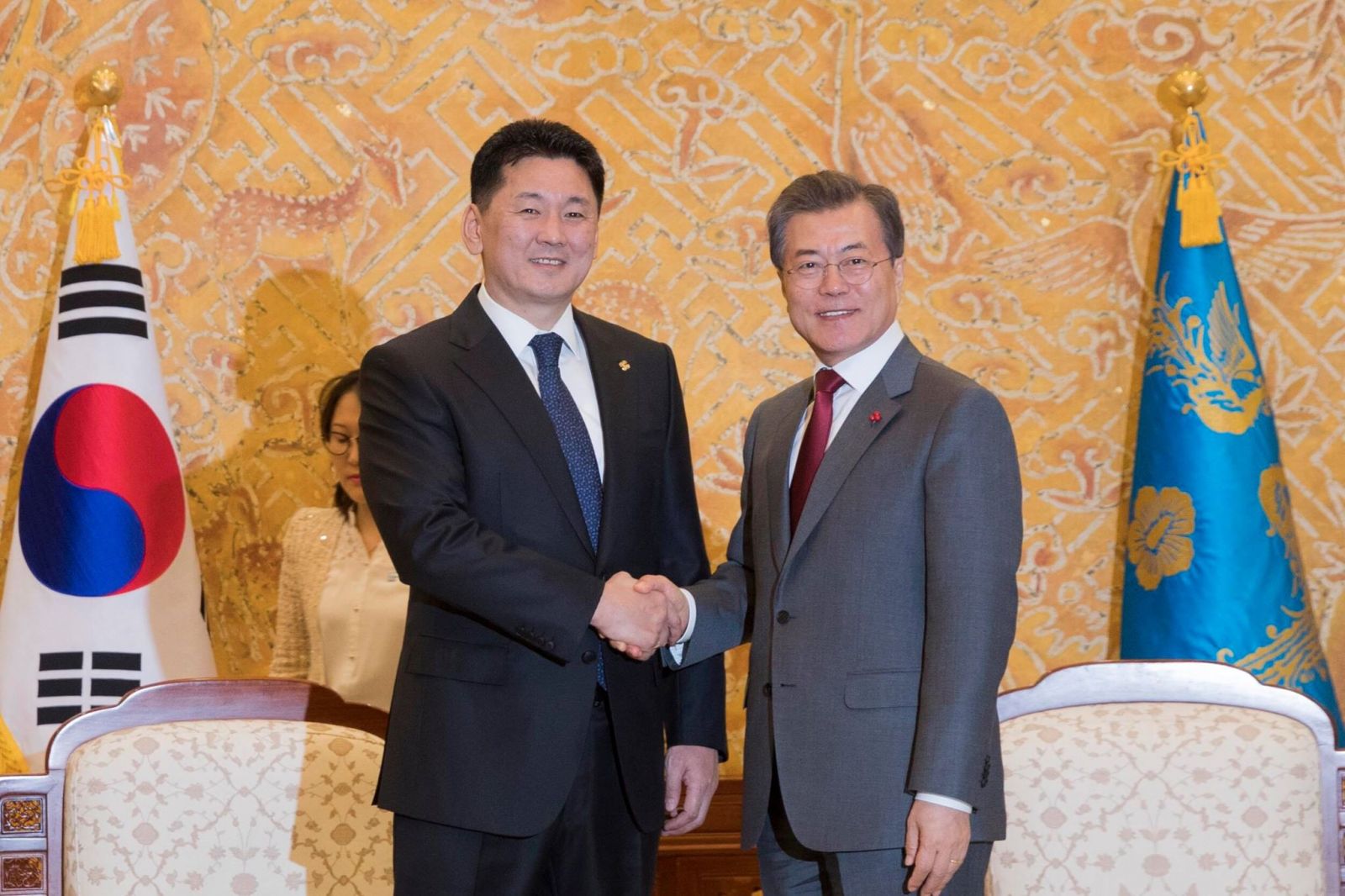 Thủ tướng Mông Cổ Ukhnaagiin Khurelsukh (trái) và Tổng thống Hàn Quốc Moon Jae-in. Ảnh: The UB Post