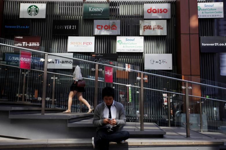 Một người đàn ông sử dụng điện thoại di động trước các bảng quảng cáo ở trung tâm thủ đô Seoul, Hàn Quốc. Ảnh: Reuters