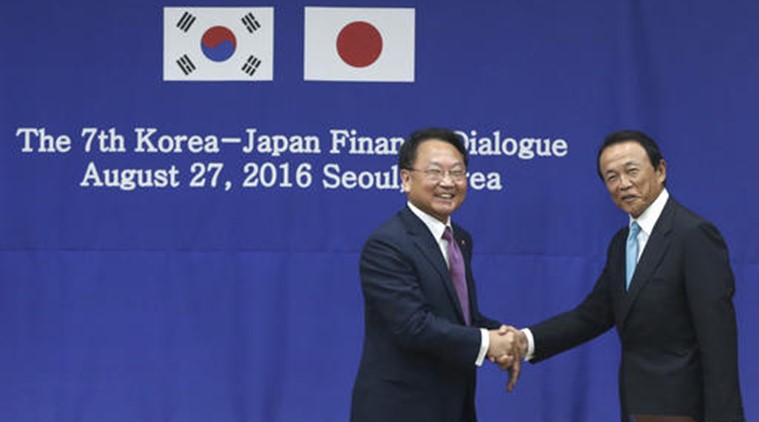 Bộ trưởng Tài chính Nhật Bản Taro Aso (bên phải) bắt tay với người đồng cấp Hàn Quốc Yoo Il-ho trong cuộc gặp hôm 27/8. Ảnh: AP