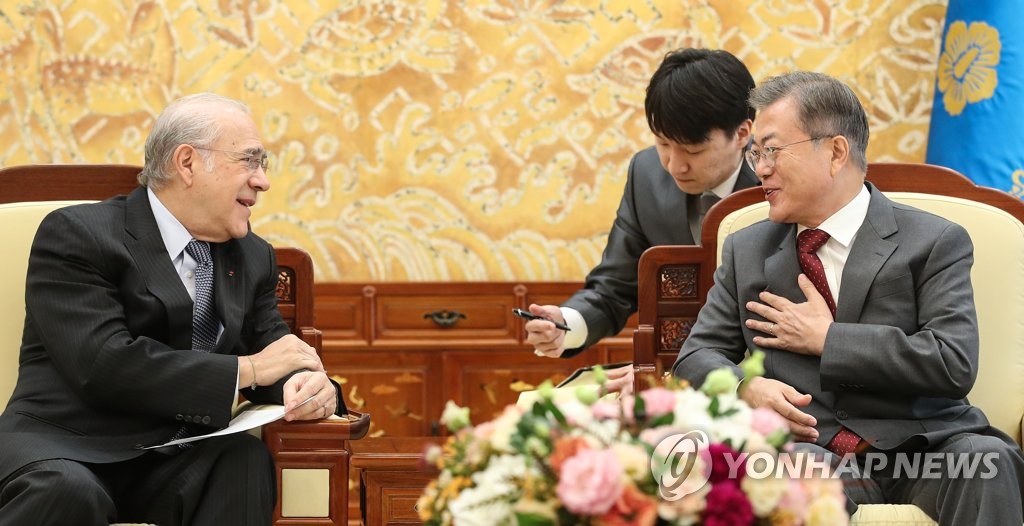 Trong cuộc hội đàm với Tổng thư ký OECD Angel Gurria, Tổng thống Moon Jae-in bày tỏ sự hoan nghênh về diễn đàn toàn cầu OECD lần thứ 6 dự kiến sẽ được tổ chức tại Hàn Quốc.