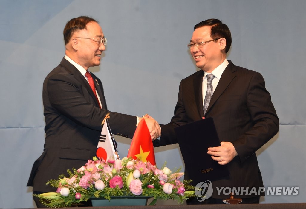 Thỏa thuận được ký kết bởi Bộ trưởng Kinh tế và Tài chính Hàn Quốc Hong Nam-ki và Phó Thủ tướng Vương Đình Huệ.