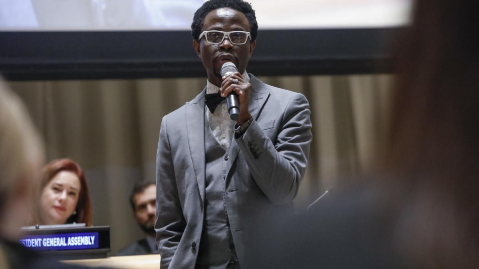 Ông Bertine phát biểu tại trụ sở LHQ để ủng hộ “Hiệp ước Toàn cầu đối với Người di cư”. Ảnh: UNHCR