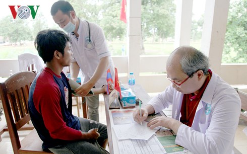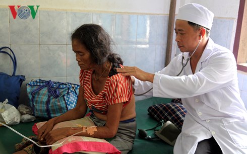 | Bác sĩ Vương Văn Vũ- Bệnh xá quân y 206 đang khám bệnh cho người dân sơ tán. |
