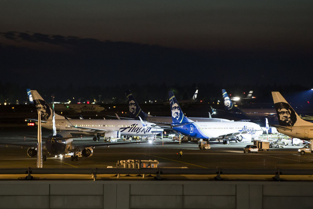 Các máy bay xếp hàng chờ tại sân bay Sea-Tac do sân bay tạm dừng các chuyến bay sau vụ cướp máy bay vào tối 10/8 Ảnh: Seattle Times