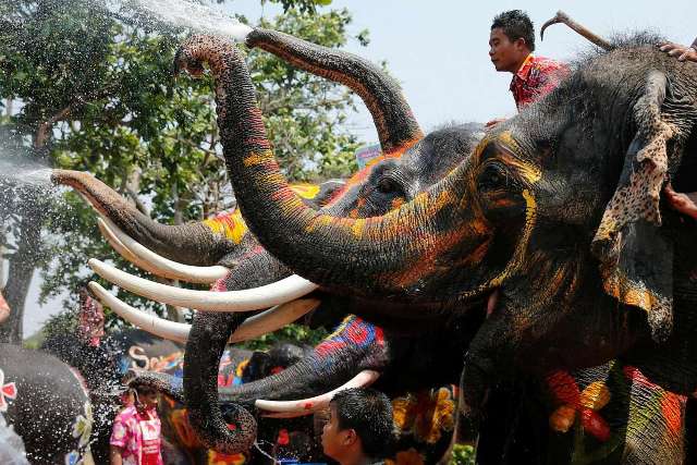 Voi phun nước vào khách du lịch trước thềm lễ hội Songkran ở tỉnh Ayutthaya, Thái Lan. Ảnh: Xinhua