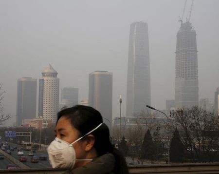Một người phụ nữ mang mặt nạ bảo vệ trong một khu vực thương mại bị ô nhiễm nặng ở Bắc Kinh, Trung Quốc. Ảnh: Reuters