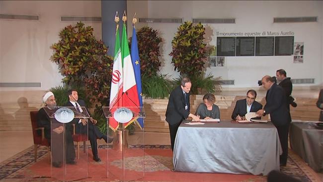 Các quan chức chính phủ Iran và Italy ký kết các hợp đồng trước sự chứng kiến của lãnh đạo hai nước tại thủ đô Rome của Ý ngày 25/1/2016. Ảnh: PressTV