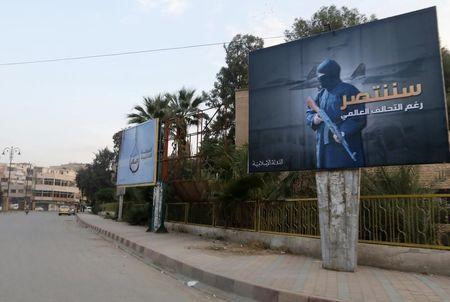 | Hình ảnh chiến binh IS trên một tấm biển trên đường phố Raqqa- "thủ phủ" của tổ chức khủng bố này- ở Syria. Ảnh AFP |