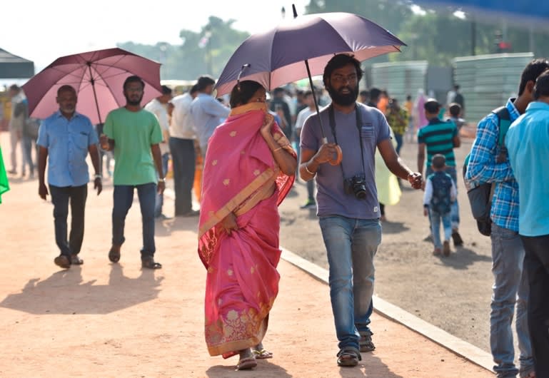 Người dân Ấn Độ mang theo ô để bảo vệ cơ thể khỏi nắng nóng ở thủ đô New Delhi. Ảnh: Nikkei