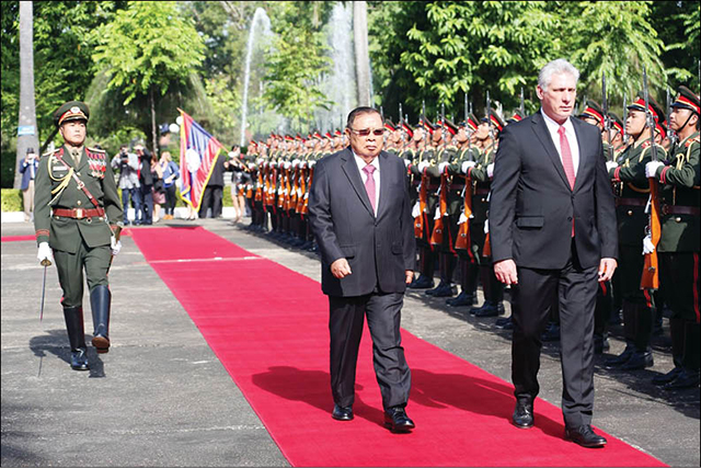 Tổng Bí thư Lào Bounnhang Vorachith (bên trái) và Chủ tịch Hội đồng Nhà nước và Hội đồng Bộ trưởng Cuba Miguel Mario Diaz-Canel Bermudez. Ảnh: Vientiane Times