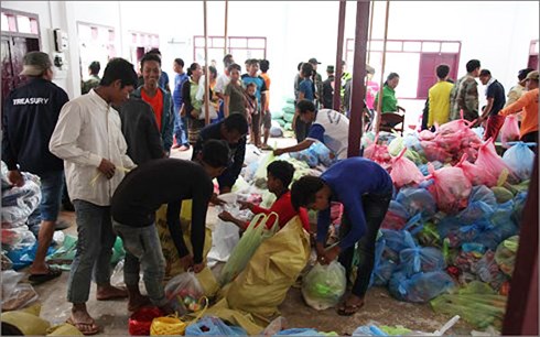 | Chuẩn bị hàng cứu trợ tại trung tâm huyện Sanamxay |