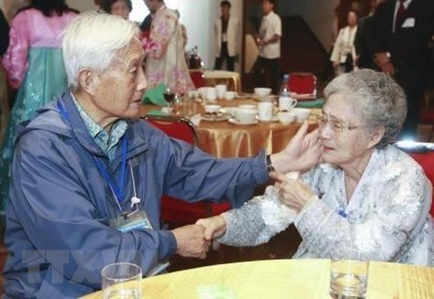 Cảnh đoàn tụ giữa một người ở Hàn Quốc (trái) và người thân ở Triều Tiên tại khu nghỉ dưỡng núi Kumagang, Triều Tiên tháng 8/2018. Ảnh: Kyodo/TTXVN