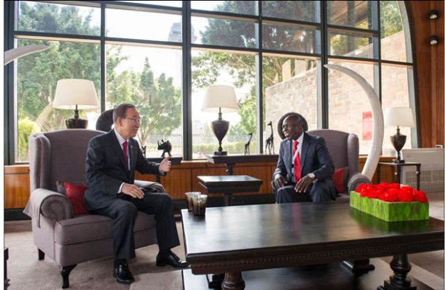 Tổng thư ký LHQ Ban Ki-moon (trái) trong một cuộc gặp với Thư ký nội các của Bộ Nông nghiệp, Chăn nuôi và Thủy sản Kenya Willy Bett. Ảnh: UN