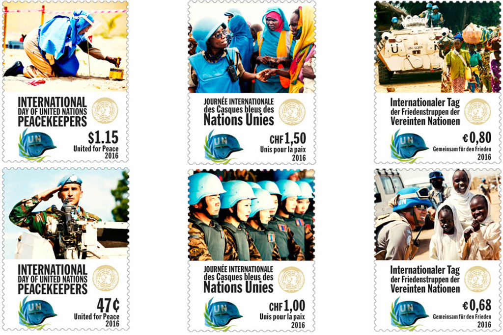 Bộ tem kỷ niệm Ngày quốc tế Lực lượng gìn giữ hòa bình năm nay. Ảnh: UNPA.