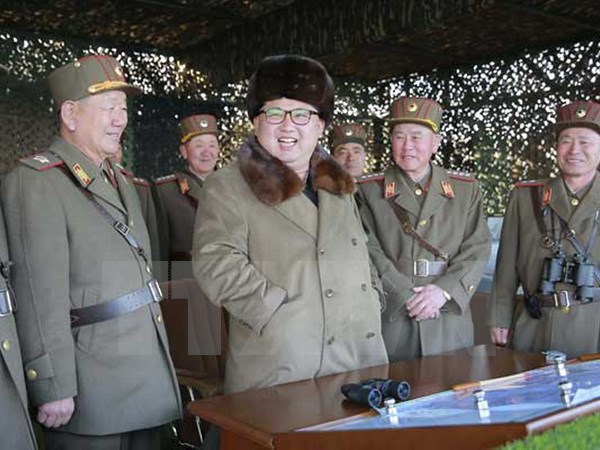Nhà lãnh đạo Triều Tiên Kim Jong-un thị sát một cuộc diễn tập quân sự tại một địa điểm bí mật ở Triều Tiên. (Nguồn: Reuters/TTXVN)