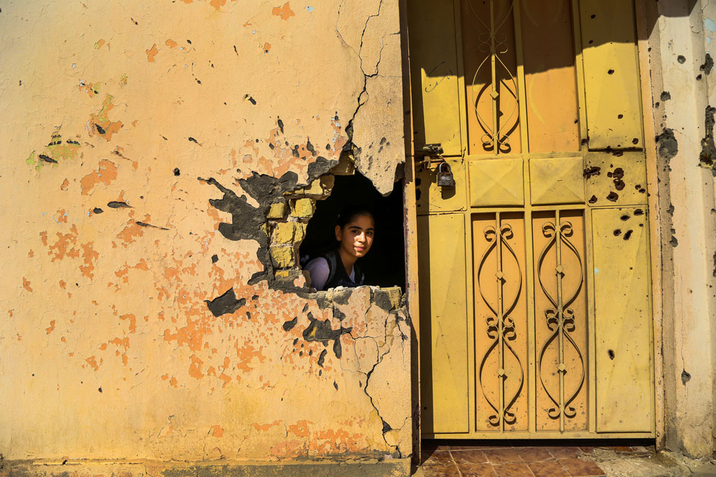 Một bé gái ngồi sau bức tường bị bom đạn ở Ramadi, Iraq. Ảnh: CNN