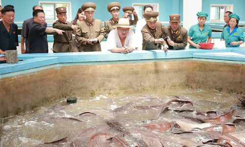 Lãnh đạo Triều Tiên Kim Jong-un (áo trắng ở giữa) đi thị sát tại một trang trại cá ở tỉnh Hwanghae. Ảnh: KCNA