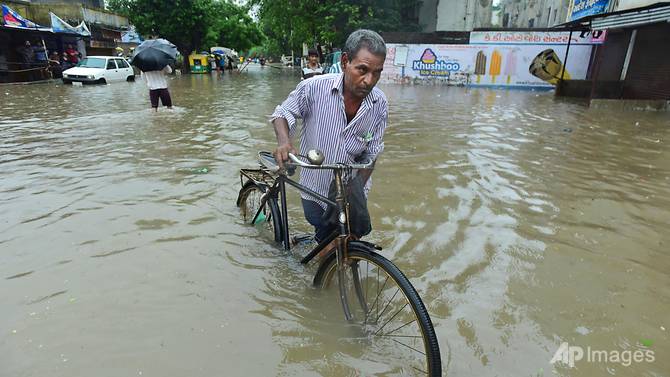 Một người dân dắt xe đạp lội qua con đường ngập nước sau khi mưa lớn ở Ahmadabad, Ấn Độ . Ảnh: AP