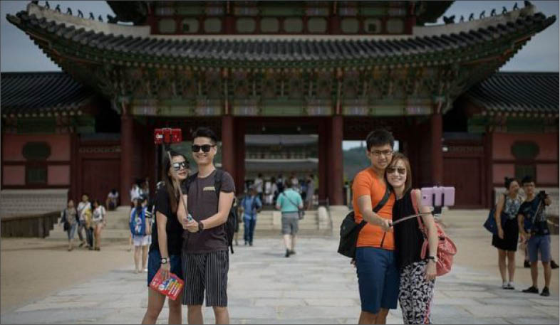 Khách du lịch nước ngoài chụp ảnh trước một ngôi chùa ở Hàn Quốc. Ảnh: Getty Images