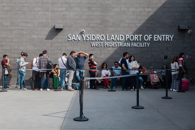 Người nhập cư xếp hàng tại cửa khẩu San Ysidro ở biên giới Mỹ-Mexico. Ảnh: AFP/TTXVN