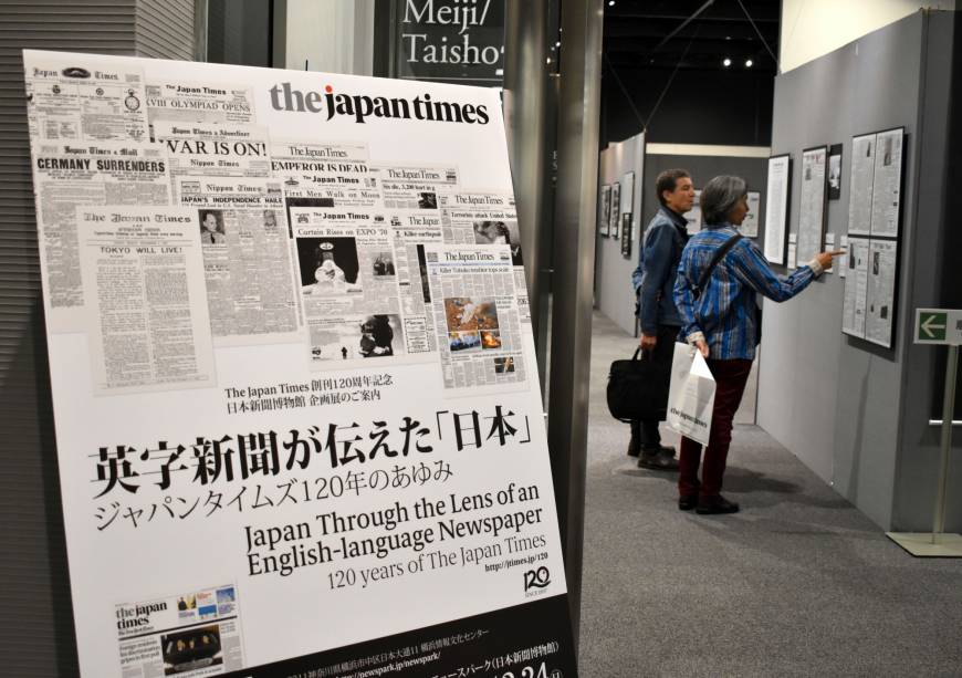 Du khách tham quan triển lãm triển lãm kỷ niệm 120 năm ngày ra tuần báo tiếng anh Japantimes (Nhật Bản) ở Yokohama. Ảnh: Japantimes