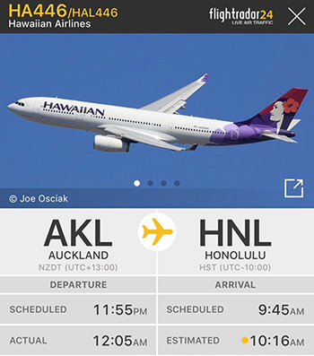 Thời gian ở New Zealand nhanh hơn ở Hawaii tới 23 tiếng. Khi các hành khách của Hawaiian Airlines hạ cánh, đồng hồ ở hòn đảo Mỹ chỉ 10h16 ngày 31/12/2017.