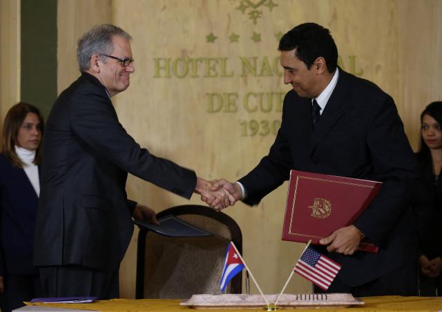 Quan chức Mỹ và Cuba bắt tay sau khi ký kết thoả thuận xử lý vấn đề tràn dầu. Ảnh: Reuters