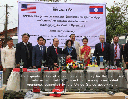 Cụ thể, phía Mỹ đã bàn giao cho lực lượng xử lý bom mìn tại các tỉnh Khammuan, Savannakhet và Attapu tổng cộng 15 chiếc xe, 150 thiết bị rà bom chất lượng cao, với giá trị lên đến 1,25 triệu USD trước sự chứng kiến của Đại sứ tại Lào Rena Bitter và Phó bộ trưởng Bộ Lao động và Phúc lợi xã hội Lào Khamkeo Sanbounkhounxay.