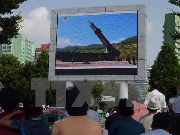 Người dân Triều Tiên theo dõi tin tức về vụ phóng tên lửa đạn đạo liên lục địa Hwasong-14 trên màn hình lớn gần một nhà ga xe lửa ở Bình Nhưỡng. Nguồn: AFP/TTXVN