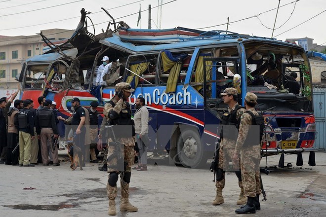 Nhân an ninh điều tra tại hiện trường một vụ nổ ở Pakistan. (Ảnh: AFP/TTXVN)