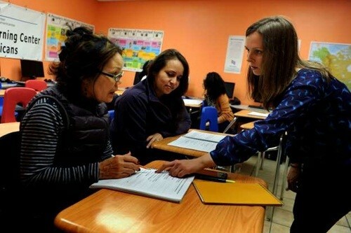 Người nhập cư trả lời câu hỏi mẫu trong bài thi nhập tịch với sự giúp đỡ của hướng dẫn viên tại một trung tâm ở Washington vào tháng 2/2015. Ảnh: Washington Post