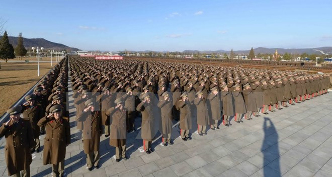 Binh sỹ quân đội Triều Tiên tại lễ tuyên thệ trung thành với nhà lãnh đạo Triều Tiên Kim Jong-Un tại Bình Nhưỡng ngày 14/2. (Nguồn: Yonhap/TTXVN)
